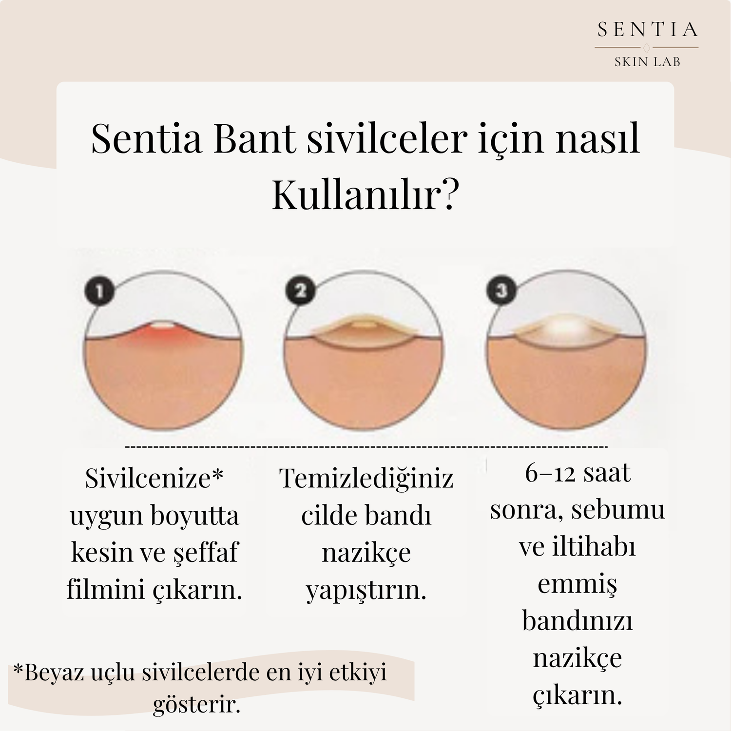 Bunun yerine gelişmiş hidrokolloid teknolojisiyle Sentia bandı cildinize yapıştırıp nazikçe iltihabın emilmesini, sivilcenin küçülmesini sağlayın.